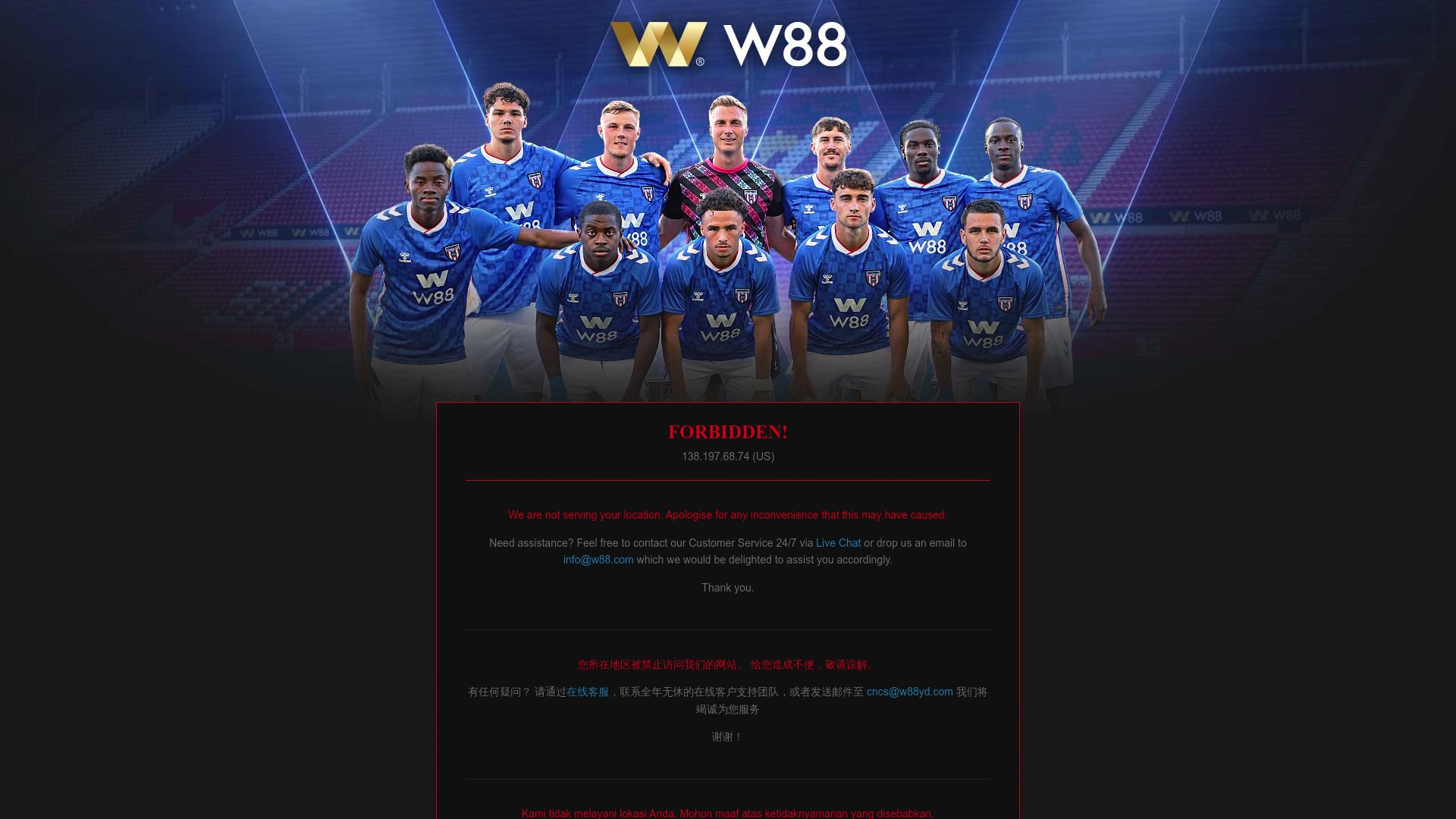 W88 provides a clear set of capabilities: sports betting, casino games, multilingual support, and live chat and email support. The site emphasizes accessible support across regions and languages though some areas see restricted access labeled as FORBIDDEN.