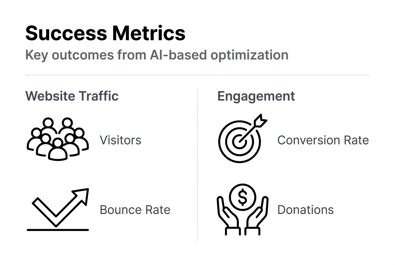 | Donations | Conversion rate, average gift, repeat donors | 15-30% growth | 3-6 months |